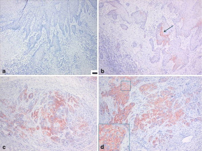CA-IX staining in vulvar squamous cell carcinomas. Representative image of a negative staining (a), 10% (b), 60% (c), and 90% positivity (d). High-power magnification of indicated area in (d) demonstrates clear membranous localization. Scale bars (a)–(c): 50 μm, (d): 10 μm