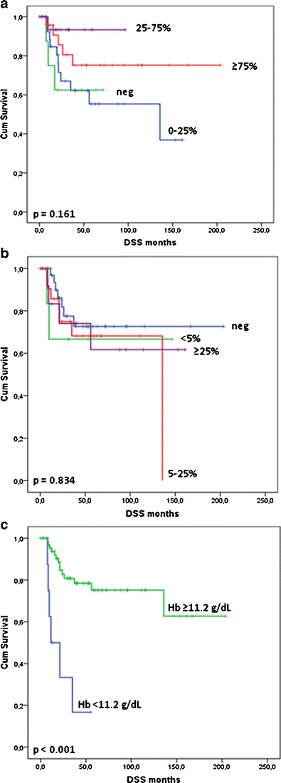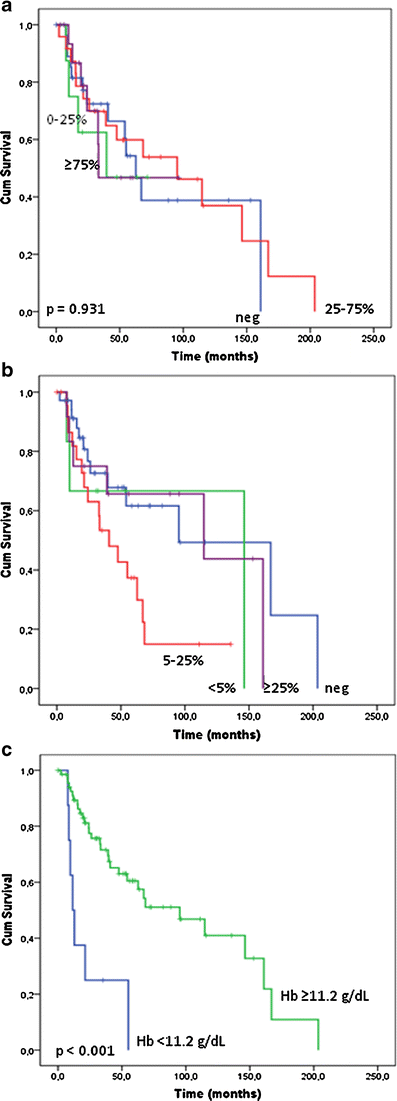 For preoperative Hb levels, significant differences were found for presence of inguinofemoral metastases or distant (log rank = 0.001) when stratified as in Table 2, and log rank <0.001 (Fig. 3c) when stratified between anemic patients (Hb < 11.2 g/dL) and patients with normal Hb levels (>11.2 g/dL).
