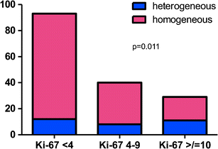 Importantly, a heterogeneous Ki-67 proliferation pattern was significantly more common in the category of cases displaying a Ki-67 labelling index ≥10%. This is in line with recent reports suggesting that intra-tumour heterogeneity holds per se a negative prognostic impact, as shown across several distinct diseases [29].