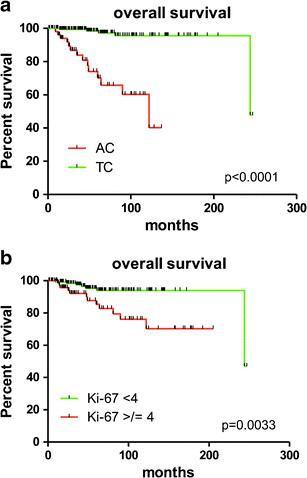 Kaplan-Meier survival curves in lung carcinoids segregated according to histological type (a) and Ki-67 > 4% (b). a Patients with a TC diagnosis had an excellent overall survival, which was significantly better compared to patients affected by ACs (p < 0.0001). b The 4% cut-off on the whole tumour cohort effectively split patients into worse categories for tumours displaying Ki-67 higher than 4% (p = 0.003)