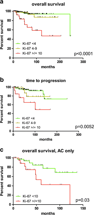 Cases were subdivided according to three different Ki-67 ranges (<4, 4–9, ≥10%) and correlation with histopathological features; pattern of Ki-67 and follow-up data were performed by Chi square test. The 4% threshold for Ki-67 is one of the most frequently adopted in literature [14, 15, 24, 25, 26], while the ≥10% cut-off was chosen based on the mean Ki-67 value of 9% observed in this series of AC (otherwise belonging to the 10–20% range mentioned for carcinoids in the current WHO classification [1]). A p < 0.05 value was considered statistically significant. Univariate time to progression and overall survival analyses were performed with the Kaplan-Meier method, and the log-rank test was employed to compare survival curves. Cox proportional hazards regression model was also used in multivariate survival analysis.