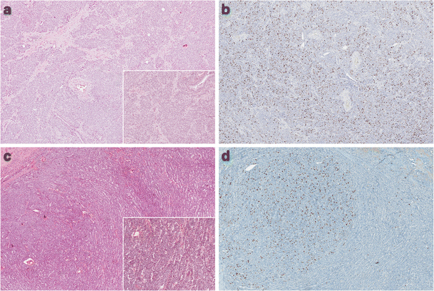 Atypical carcinoids showing different Ki-67 patterns (homogenous versus heterogeneous). ACs with organoid and trabecular growth patterns (a and c: H&E 40×, inset 100×) showing a homogenously (b: 40×) and heterogeneously (d: 40×) increased Ki-67 index, in both cases up to 12%
