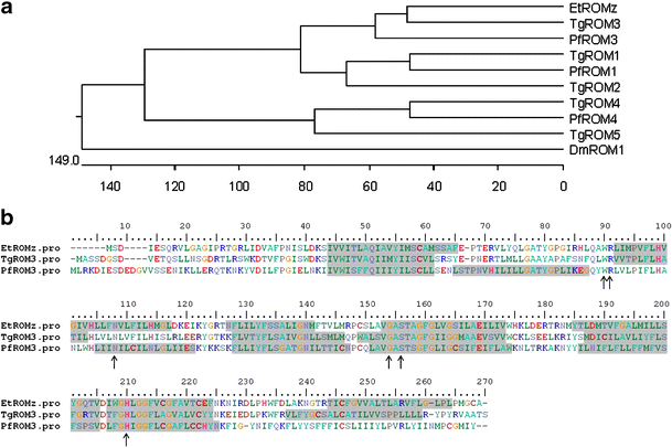 Sequence analysis of EtROMz sequences. a Phylogenetic tree of the ROMs from some apicomplexan species. Species abbreviations: Dm, D. melanogaster; Et, E. tenella; Pf, Plasmodium falciparum; Tg, T. gondii. GenBank accession numbers are as follows: EtROMz, ABC50099; TgROM1, AAT29065; TgROM2, AAT29066; TgROM3, AAT39987; TgROM4, AAT29067; TgROM5, AAT47708; PfROM1, PF11_0150; PfROM3, MAL8P1.16; PfROM4, PFE0340c; and DmROM1: AAF47496. b Alignment of the TM domains and some surrounding amino acids of EtROMz, TgROM3, and PfROM3 from the E. tenella, T. gondii, and P. falciparum of Apicomplexa. The TM domains predicted by TMHMM (http://www.cbs.dtu.dk/services/TMHMM-2.0/) are shown in gray. Residues corresponding to W, R, N, G, S, and H of ROMs are marked with arrows
