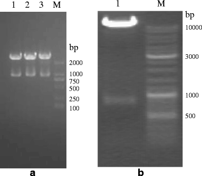 Restriction endonuclease Sal I/Sac I digestion patterns. a Characterization of pMD18-T-Rho by restriction enzyme digestion and analyzed by electrophoresis. M, DNA Marker 2000; 1, 2, 3, pMD18-T-Rho digested by Sal Ι/Sac Ι. b Characterization of pSos-Rho by restriction enzyme digestion and analyzed by electrophoresis. M, DNA Marker 10000; 1, pSos-Rho digested by SalΙ/SacΙ