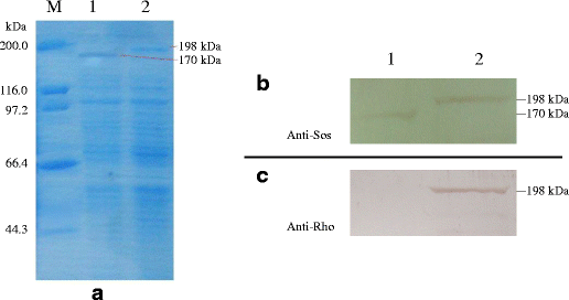 Detection of rhomboid protein expression. a The Sos and Sos–Rho fusion protein were expressed in yeast cells and evaluated by SDS-PAGE and stained with Coomassie blue. M, protein MW marker (high); lane 1, Sos protein expressed by pSos plasmid; 2, Sos–Rho fusion protein expressed by pSos-Rho. b Western blot of yeast cell lysates using anti-Sos monoclonal antibody to detect Sos and Sos–Rho fusion protein expression. c Western blot of yeast cell lysates using mouse anti-sporozoites of E. tenella polyclonal sera to detect rhomboid protein expression. All size markers denote kilodalton