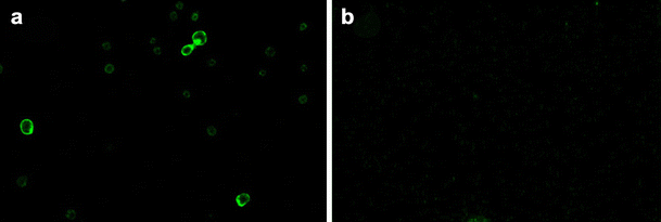 Indirect IFA of rhomboid protein in yeast cells. a Yeast cells were transformed with recombinant plasmid pSos-Rho. b Yeast cells were transformed with plasmid pSos. The yeast cells were fixed, and IFAs were performed using an immune serum against sporozoites of E. tenella followed by goat anti-mouse IgG-FITC antibody. Fluorescent images were examined