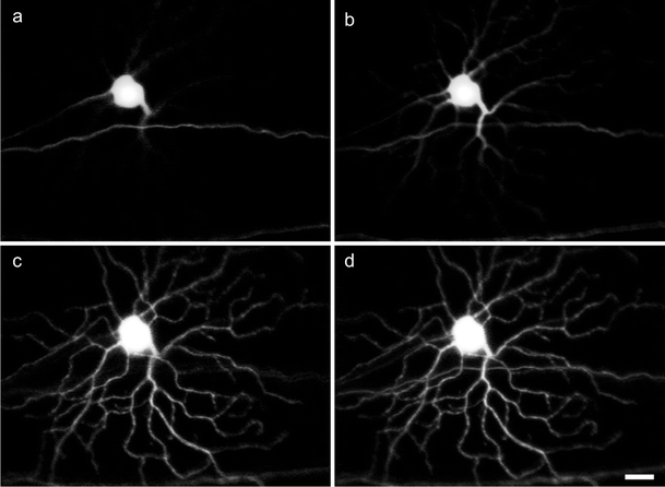 In vivo fluorescence images of a ganglion cell expressing fluorescence protein obtained by using an adaptive optics confocal laser scanning instrument. a–c Images obtained from three focal planes. d Maximum intensity projection image generated from five separate focal planes. Bar 20 μm. Adapted with permission from Biomed Opt Express (Geng et al. 2012)