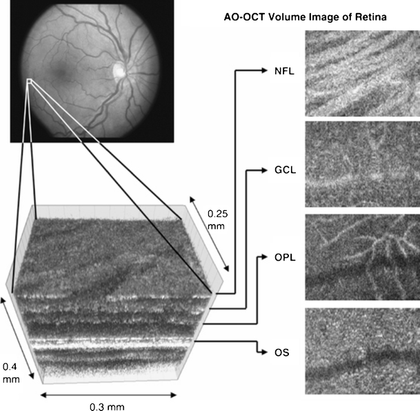 Adaptive optics-optical coherence tomography (AO-OCT) image of a human retina in vivo acquired over a 1° retinal region. The images right are en face views of the particular retinal layers. Retinal layers from top to bottom are: nerve fiber layer (NFL), ganglion cell layer (GCL), outer plexiform layer (OPL) and outer segment layer of photoreceptors (OS). Reprinted with permission from Macmillan (copyright; Miller et al. 2011)