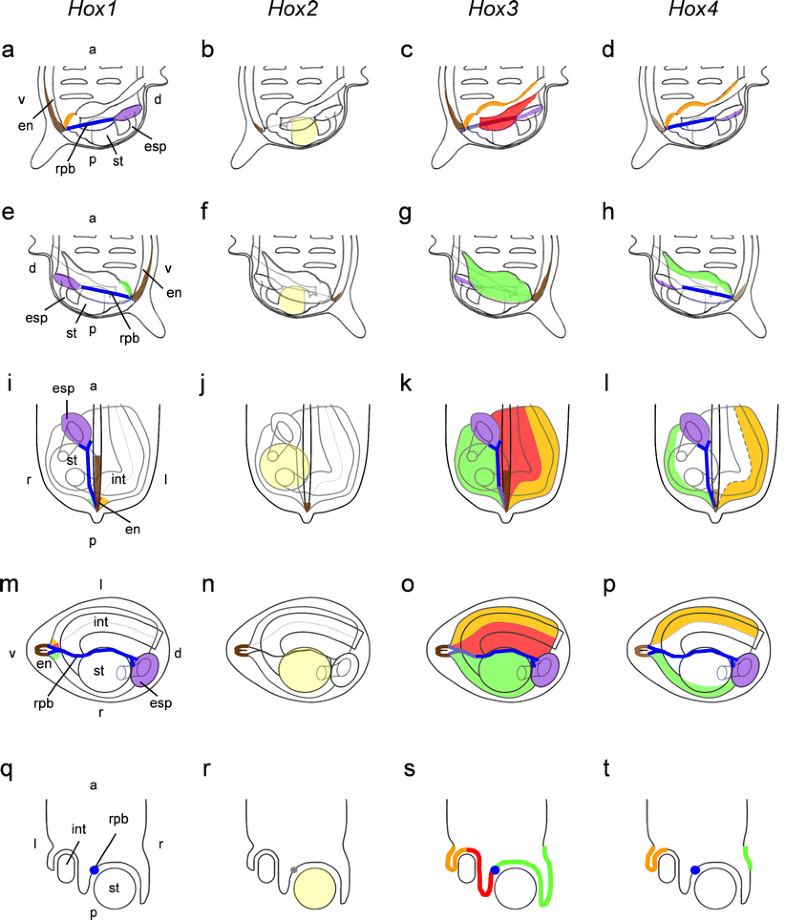 Schematic drawing of Hox gene expression in Fig. 3. Expression domains are indicated by colors: brown endostyle, purple esophagus, blue retropharyngeal band, green right epicardium, orange left of left epicardium, red right of left epicardium (abbreviations as in Fig. 1). (GIF 116 kb)