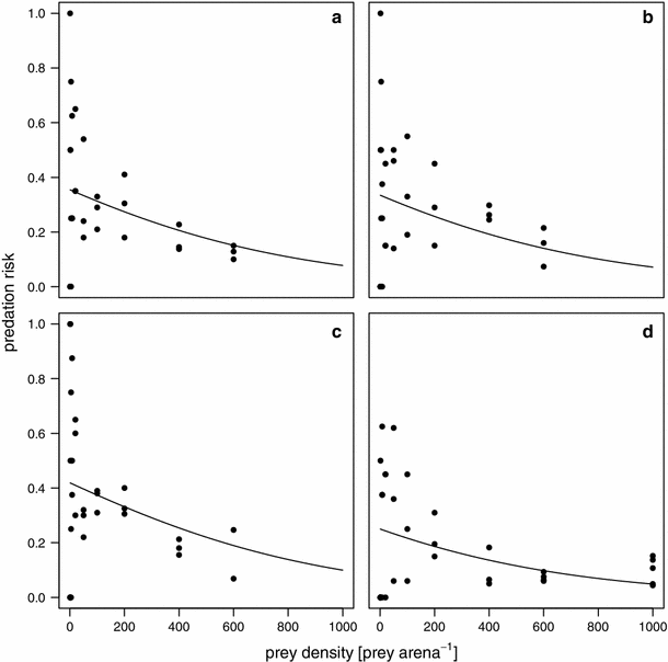 Results of the best-fitting polynomial regression model to test for the shape of the functional response depicting the different leaf litter density treatments of a 1 g, b 2 g, c four g and d 8 g leaf litter per arena, respectively. The model included the negative linear term p 1 = −0.0019 (SE = 0.0007, t = −2.731, p < 0.01) and four litter-dependent constants: p 0 (1 g) = −0.5989 (SE = 0.2057, t = −2.911, p < 0.01), p 0 (2 g) = −0.6860 (SE = 0.2115, t = −3.243, p < 0.01), p 0 (4 g) = −0.3267 (SE = 0.1927, t = −1.696, p = 0.092) and p 0 (8 g) = −1.0978 (SE = 0.2639, t = −4.161, p < 0.001)