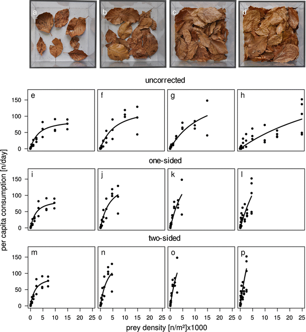 The leaf litter within the experimental arenas (0.04 m2 ground area) of the four treatments with a 1 g dry weight leaf litter, b 2 g, c 4 g and d 8 g. Beneath are the functional response curves according to the respective best-fitting model for the uncorrected (e–h), one-sided (i–l) and two-sided (m–p) densities. Parameter values are given in Table 2