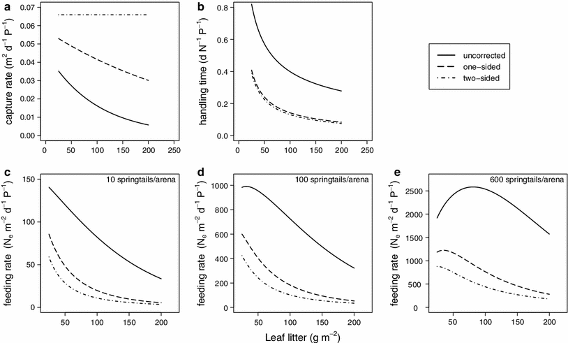Relationship between leaf litter density and a capture rates and b handling times. Curves are based on the best-fitting functional-response models with uncorrected (solid line), one–sided (dashed line) and two-sided (dash-dotted line) prey densities. c–e show the resulting relationships for leaf litter density and consumption rates at 10 (c), 100 (d) and 600 (e) prey individuals per experimental arena