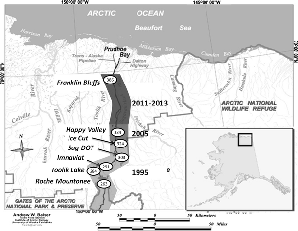 Breeding Bird Survey data indicate that the number of Gambel’s white-crowned sparrows encountered along a point-count transect greatly diminishes north of the Brooks Range in Alaska, and although these numbers seem to fluctuate between years, they are currently increasing (Sauer et al. 2014) (Supplemental Fig. 1). The decline in bird numbers from south of the Brooks Range to the northern limit of the range can be attributed to reductions in suitable habitat as shrubs become patchier and more disparate. In 1987, the breeding range extended north to MP 303 on the James Dalton Highway (Fig. 1). In 2005, birds were present at MP 334 (Happy Valley; 69°09′N, 148°49′W) although no evidence of breeding was found. However in 2011, birds were found breeding further north around MP 386 and two non-breeding males were found 16 km further north at MP 396 (69°58′N, 148°42′W). The edge of the population’s range has moved a geographical distance of 75 miles (120 km) north in 24 years with a population estimated to be between 24 and 40 birds, depending on the sampling year, which have successfully reproduced (Wingfield, unpublished data). In the present study, birds inhabiting areas colonized after 2005 (MP 386) are termed “range limit” and birds found in existing range (MP 266–303) are termed “historic range”.