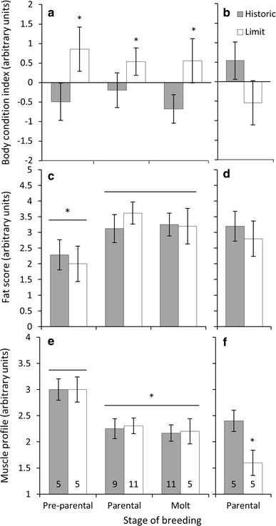 The effect of geographical range location on body condition index, total fat stores, and muscle profile in Gambel’s white-crowned sparrow a, c, e males during the pre-parental, parental and molt stages and in b, d, f females during the parental stage. Significant differences between range limit (Limit) and historic range (Historic) were observed for body condition in a males, and muscle profile in f females. In males, regardless of range, c fat stores were smaller and e muscle profiles were larger during the pre-parental stage compared to all other stages. Body index scores were generated by performing a principal components (PC) analysis for tarsus, wing, and beak measurements. The PC1 score was saved, regressed against body mass, and then the residuals were used for range comparison. Values are presented as mean ± SEM. e, f Numbers within bars indicate sample sizes for each group. *P < 0.05