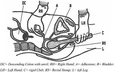 Manual lysis of adhesions at the tip of the rectal stump, which was identified using a rigid club. Previously the anvil of a circular stapler was placed intraluminal of the descending colon. DC, descending colon with anvil; RH, right hand; A, adhesions; B, bladder; LH, left hand; C, rigid club; RS, rectal stump; L, left leg