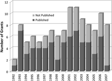 Grants resulting in publication or no publication, based on award year; average time from grant award to publication is 2.6 years