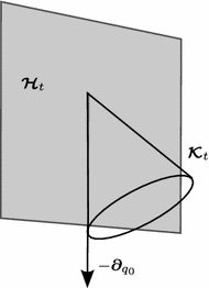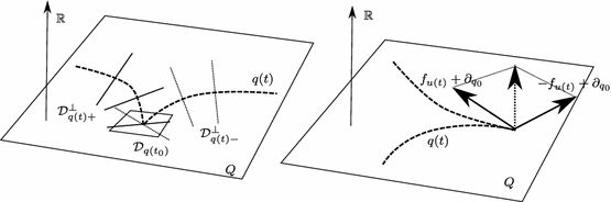 In a similar way one deals with a cusp-type singularity. At a cusp we would have limit vectors \(\pm f_{u(t_0)}(q(t_0))+\partial _{q_0}\) in \(\varvec{\mathcal {H}}_{t_0}\) (see Fig. 6). Now \(0+2\partial _{q_0}\), the sum of these two vectors, would belong to \(\varvec{\mathcal {H}}_{t_0}\) which contradicts the normality of the extremal. Roughly speaking, the existence of singularities of corner-type or cusp-type implies \(\partial _{q_0}\in \mathcal {H}_{t_0}\), i.e., either a trajectory is not an extremal or it is abnormal.
