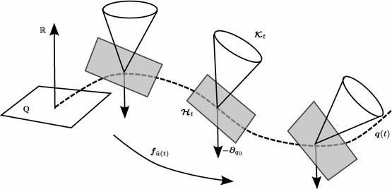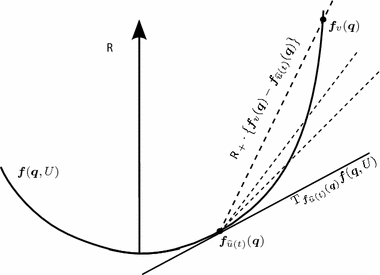 Since the cone \(\varvec{\mathcal {K}}_t\) contains all secant rays \(\mathbb {R}_+\cdot \left\{ \varvec{f}_v({\varvec{q}})- \varvec{f}_{\widehat{u}(t)}(\varvec{q})\right\} \) and is closed, it must contain the tangent space \(\mathrm {T}_{\varvec{f}_{\widehat{u}(t)}(\varvec{q})}\varvec{f}(\varvec{q},U)\)