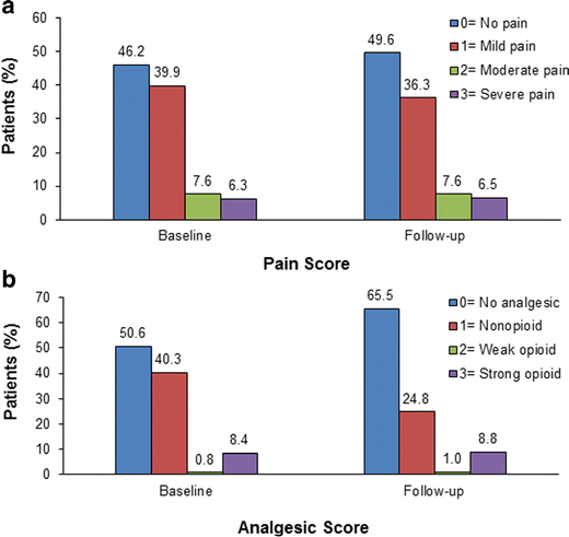 Pain score (a) and analgesic score (b) for 524 patients eligible for analysis at both baseline and follow-up