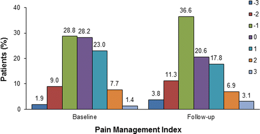 Pain management index for 365 patients at baseline and 320 patients at follow-up who were in pain or taking analgesics (or both)