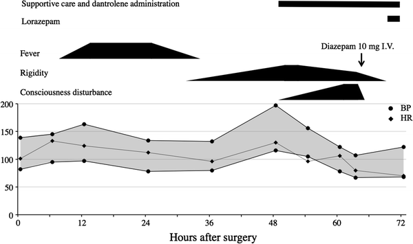 NMS is defined as a syndrome with hyperthermia, bradykinesia, rigidity, fluctuating consciousness, and autonomic dysfunction and is considered to be caused by dopamine hypoactivity. It can occur during the postoperative period as the result of the administration of major tranquilizers, including droperidol [1, 2]. This syndrome is lethal in 10 % of cases [3]; however, it is a self-limited disorder in most cases and frequently responds to conservative management after cessation of the drugs. Although hyperthermia is one of the major features of this syndrome, the maximum temperature can be less than 37.8 °C [4]. The treatment of NMS also includes the withdrawal of the suspected agent and the administration of dantrolene and bromocriptine.