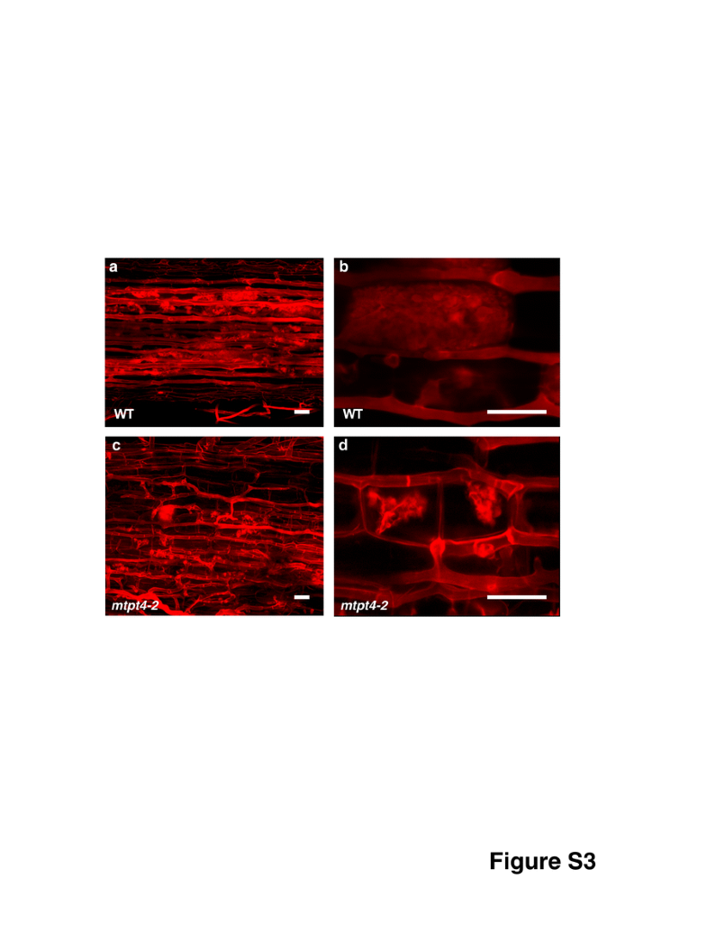 Mycorrhizal phenotype of M. truncatula wt (a, b) and mtpt4-2 (c, d) roots colonized by R. irregularis. Roots were harvested 60 dpi, stained with acid fuchsin and observed with a confocal microscope. Arbuscules in mtpt4-2 are degenerated as described in Javot et al. (Javot et al. 2011). Bars = 25 μm. (GIF 119 kb)