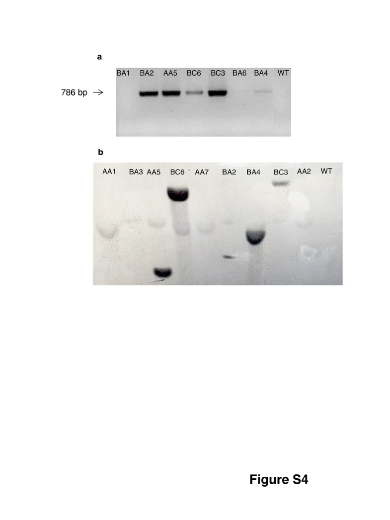Molecular analyses of O. maius transgenic strains expressing RiPEIP1. (a) Gel electrophoresis of PCR products obtained from genomic DNA of wt and transgenic strains using RiPEIP1 specific primers (b) Southern blot of genomic DNA from wt and transgenic strains restricted with BglII enzyme and hybridized with the RiPEIP1 probe. Lanes corresponding to BC6, BA2, BA4 samples exhibited a single genomic insertion. (GIF 114 kb)