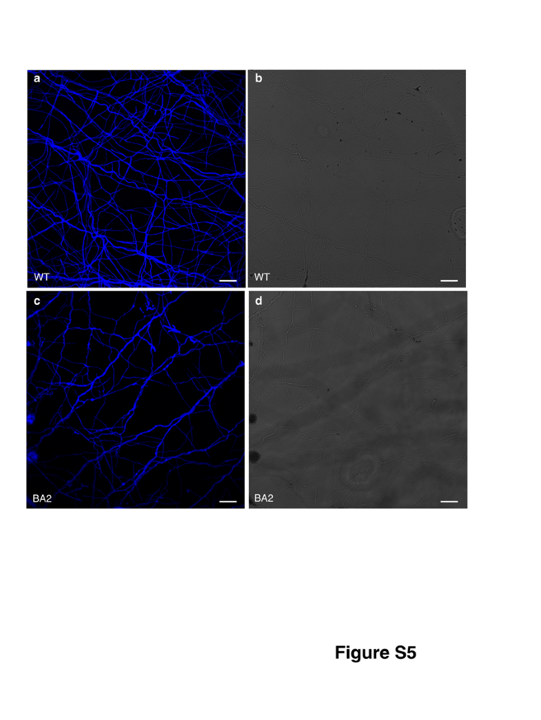 Phenotype of O. maius free living mycelia from wt and RiPEIP1-expressing strain BA2 as revealed by calcoflour white staining. Laser-scanning microscope observation of one-month-old O. maius wt and transgenic strains stained with calcofluor white. Transmitted light images are shown on the right (b, d) and the corresponding fluorescence images on the left (a, c). Bars: 10 μm (GIF 188 kb)