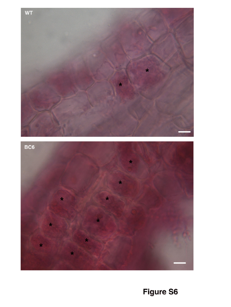 Mycorrhizal phenotype of O. maius wt and RiPEIP1-expressing strain BC6. Mycorrhized V. myrtillus roots were stained with acid fuchsin and observed 2 months after fungal inoculation. O. maius transgenic strains showed an increased number of coils (asterisk) in epidermal cells compared to the wt. (GIF 426 kb)