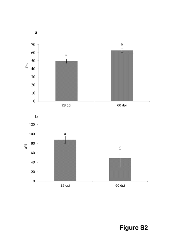 Colonization level of M. truncatula roots at 28 and 60 days post inoculation (dpi) assessed accordingly to Trouvelot et al. (1986). F%: frequency of mycorrhization in the root system (a), a%: arbuscules abundance in mycorrhizal parts of root fragments (b). Different letters indicate statistically significant difference (p < 0.05 ANOVA, Tukey’s post-hoc test) (GIF 17 kb)