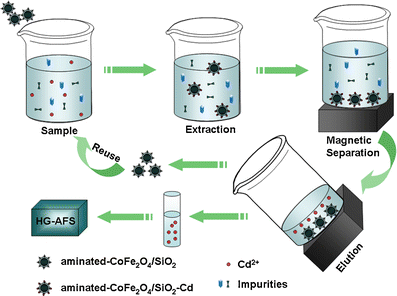 We report on the synthesis and evaluation of aminated-CoFe2O4/SiO2 nanoparticles that can serve as a selective solid-phase sorbent for the extraction of cadmium ion. The nanoparticles consist of a magnetic CoFe2O4 core and an amino-modified silica shell. They can efficiently extract cadmium(II) ion and then can be isolated from the sample solution due to the magnetic nature of the core. The effects of the experimental conditions on the extraction process were optimized. Cadmium was then quantified by hydride generation atomic fluorescence spectrometry. The resulting calibration curve is linear in the concentration range of 0.01–10 μg L−1, the instrumental detection limits (3σ) is 3.15 ng L−1 and the relative standard deviation is 4.9 % at the 1.0 μg L−1 level (for n = 11). The enrichment factor is 50 (for 50 mL samples), and the adsorbent can be used for at least 45 cycles of preconcentration and elution. The method was applied to the determination of cadmium in environmental water samples, and successfully validated by analyzing two certified reference materials.