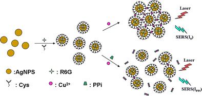 The cysteine and R6G functionalized silver nanoparticles (AgNPs) were synthesized as a surface-enhanced Raman spectroscopic (SERS) substrate to detect pyrophosphate ion (PPi). It is based on the competitive coordination of Cu(II) between cysteine (Cys) and PPi.