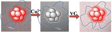 Schematic presentation of the gold nanocluster based probe whose fluorescence is quenched by Cu(II) ions and then restored by addition of vitamin C. This is demonstrated for both aqueous solutions and living cells.