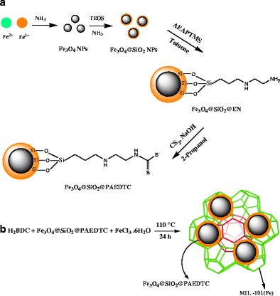 A novel magnetic metal-organic framework [a MIL-101(Fe)/2-(propylamino-ethyl) dithiocarbamate modified magnetite nanoparticle composite] was synthesized and utilized for speciation analysis of Cr(III) and Cr(VI) via determination by electrothermal atomic absorption spectrometry. (a) A schematic representation for synthesis of Fe3O4@PAEDTC NPs. (b) Schematic illustration of the synthesis of MIL-101(Fe)/Fe3O4@ PAEDTC nanocomposite.