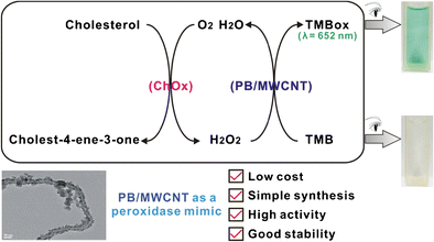 Schematic of a carbon nanotube-supported Prussian blue (PB/MWCNT) hybrid used as a promising peroxidase mimic. It has the advantages of low cost, simple synthesis, high activity, and good stability. PB/MWCNTs along with cholesterol oxidase (ChOx) are used in a colorimetric assay for the determination of free cholesterol.