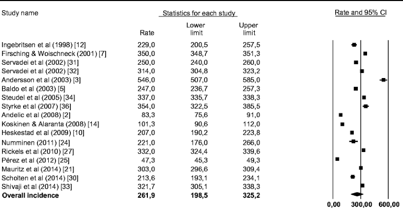 Data are reported as in the original manuscripts. For calculation of an overall incidence rate in the meta-analysis, we used random effects modelling to address heterogeneity between the studies. Heterogeneity was expressed by the τ2 and I 2 statistics. Tau-squared represents the estimate of the between-study variants in a random effects meta-analysis. A τ2 > 1 suggests the presence of substantial statistical heterogeneity. I 2 represents the percentage of the total variation across studies due to heterogeneity [11]. Comprehensive Meta-Analysis (CMA) software was used for the calculations.