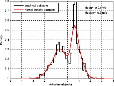 Probability density distribution of all QM adjustments applied to monthly mean surface wind speed