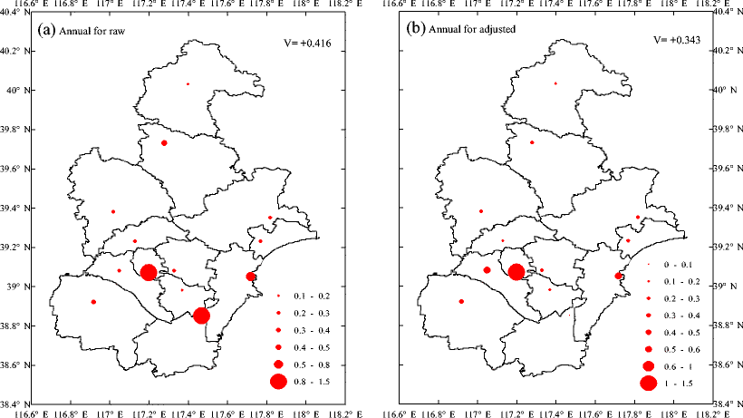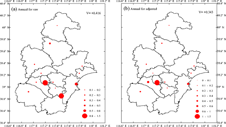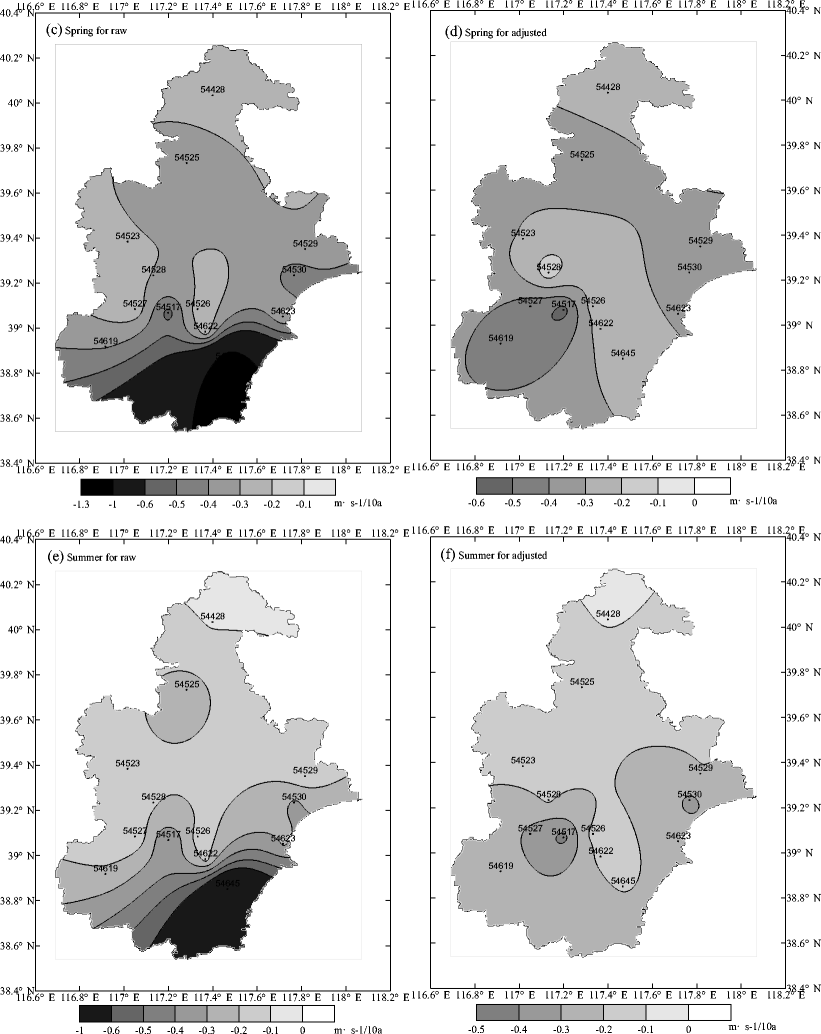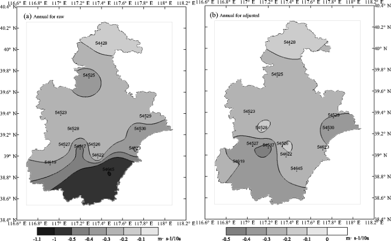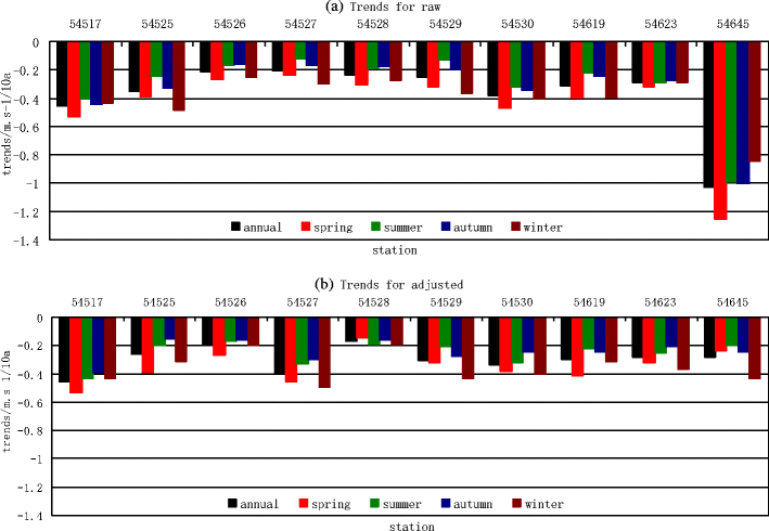 A comparison of trend changes before and after adjustment suggests that spatial distributions of wind speed trend based on the adjusted data agreed with characteristics of urban climate change in the Tianjin region. The trends in regional average annual and seasonal (spring, summer, autumn, winter) wind speed series based on the adjusted data were −0.277, −0.325, −0.228, −0.223, and −0.336 m s−1/10a, respectively. These were generally consistent with those measured in Beijing by Li et al. (2011). The trend amplitudes also reflected a weakening wind speed in spring and winter that was larger than those in summer and autumn in Tianjin, and also similar to annual and seasonal wind speed variations over China (Xu et al. 2006; Jiang et al. 2010; Guo et al. 2011; Fu et al. 2011; Chen et al. 2013). At the same time, a comparison to the trends of geostrophic wind speed illustrated that wind speed series based on the homogenized data were more reasonable than those from the raw data, regardless of the trend change or amplitudes.