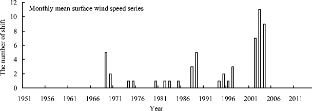 Temporal distribution of the number of shifts in monthly mean surface wind speed series for 1951–2014