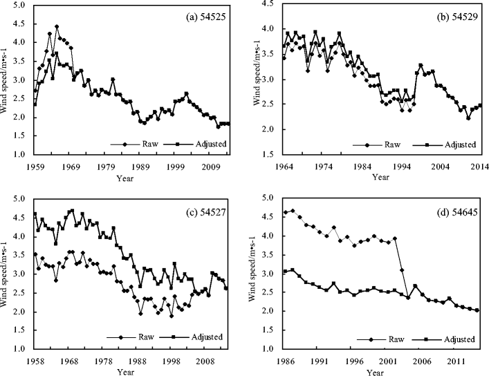 The shifts in monthly mean surface wind speed series at Tianjin (54527) and Hangu (54530) stations were both due to the effects of automation, based on their metadata. These shifts occurred between 2002 and 2004, especially for station 54527, where the monthly series from January to December in 2003 all have breakpoints. The annual values of wind speed based on the raw monthly series at station 54527 (Fig. 3c) were abnormally smaller before 2004 due to automation, but much larger for station 54530 prior to 2004. Similarly, data homogenization almost corrected the shifts at the two stations caused by automation, making their wind speed data relatively reasonable.
