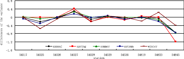 Differences in variance between raw and adjusted annual and seasonal mean wind speed at 10 stations