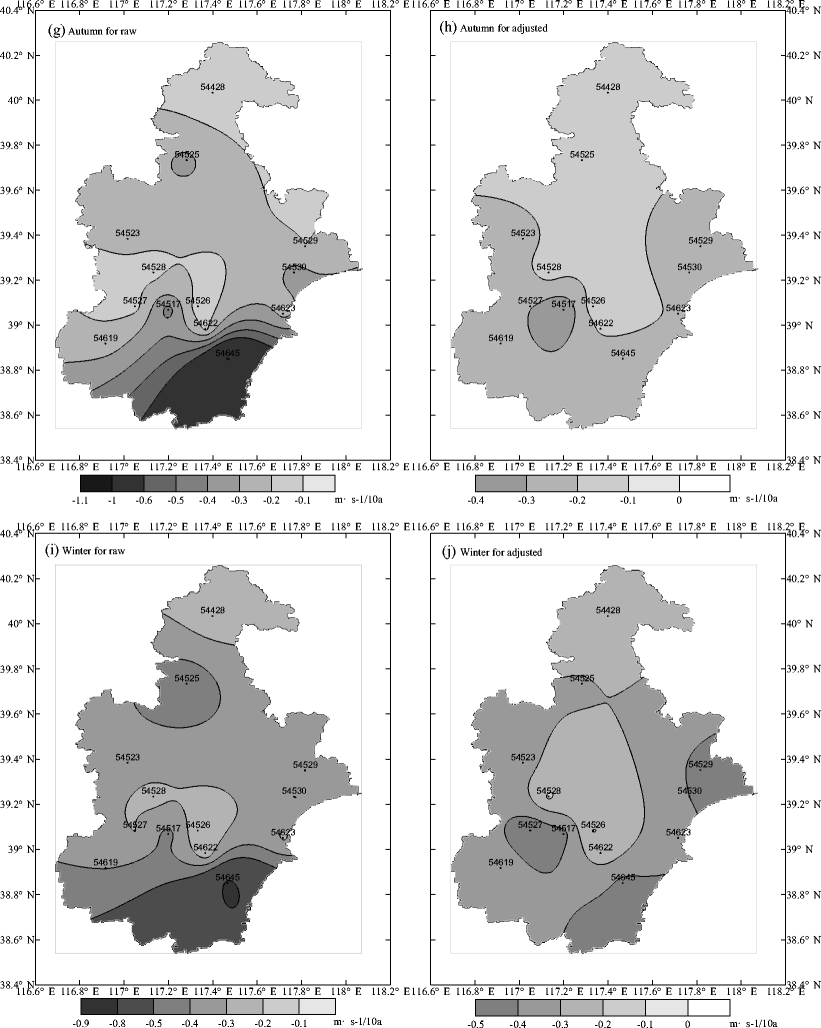 The spatial distributions of seasonal mean wind speeds were more consistent when homogenized compared to raw trends (Fig. 7c, e, g, i). Trends in the northern and central regions were smaller, while in the southwest (city area) they had large decreasing values (Fig. 7d, f, h, j). The trend distributions were similar in spring and winter (Fig. 7d, j) with larger decreasing trends, and almost identical in summer and autumn (Fig. 7f, h) with smaller reducing trends. This is consistent with monsoon circulation dominating climate in the Tianjin area.