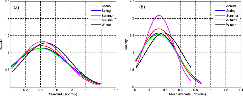 Probability density function of standard error (a) and mean absolute error (b) between the data adjusted here and those from NMIC