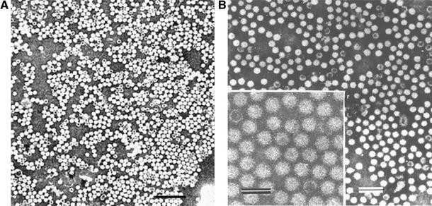 Transmission electron micrographs of XSV (a) and MrNV (b) virions purified on CsCl gradients. Bars = 100 nm. Inset in b: higher magnification of MrNV; bar = 50 nm. Reproduced from reference 10 with permission from Elsevier