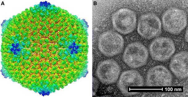 The virions of mavirus and Sputnik. A. Cryo-EM reconstruction of the Sputnik virion (adapted from reference 110, Electron Microscopy Data Bank ID 5495). B. Negative stain electron micrograph of mavirus particles (U. Mersdorf, Max Planck Institute for Medical Research)