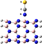 The behavior of the thiocyanate anion (SCN−) adsorbed on the external surface of H-capped (6,0), (7,0), (8,0), and Ga-doped (6,0) zigzag single-walled boron nitride nanotubes was studied by using density functional calculations. Geometry optimizations were carried out at the B3LYP/6-31G* level of theory using the Gaussian 03 suite of programs. We present the nature of the SCN− interaction in selected sites of the nanotubes. Our results show that the pristine boron nitride nanotubes cannot significantly detect SCN−. The calculated binding energy of the Ga-doped (6,0) single-walled boron nitride nanotube indicated that SCN− can be absorbed significantly on the Ga site and these nanotubes can therefore be used for SCN− storage. Binding energy corresponding to adsorption of SCN− on the Ga site in the Ga-doped (6,0) single-walled boron nitride nanotube was calculated to be −263.3 kJ mol−1. The calculated binding energies for SCN− in N-down orientation are higher than those in S-down orientation for all of the configurations. Also, we showed that the nanotube diameter has no significant role in determining the binding energy of SCN− and only the orientation and location of the SCN− and also doping of nanotubes by other atoms play an important role in determining the binding energy. The decrease in global hardness, energy gap, and ionization potential due to SCN− adsorption leads to a the lowering of stability and increase in reactivity of the (6,0) zigzag SCN−– and Ga-doped (6,0) zigzag SCN−–boron nitride nanotube complexes.