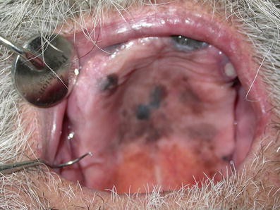 Multiple asymmetric melanotic macules with irregular borders, brown to black color, 0.5 to 2 cm in diameter on all of the hard and soft palate