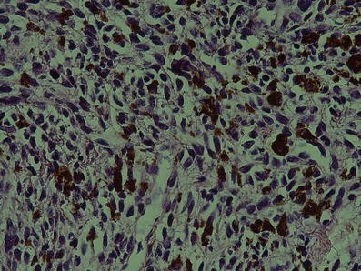 Malignant spindled or ovoid melanocytes with hyperchromatic and pleomorphic nuclei and considerable amount of melanin are present in histopathologic view
