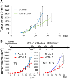 Although chemoimmunotherapy often lengthens glioblastoma (GBM) survival, early relapses remain problematic as immunosuppressive M2 macrophages (Mϕ) that function via inhibitory cytokine and PD-L1 production cause immunotherapy resistance. Here, we detail anti-PD-L1 antibody effects on the tumor microenvironment, including Mϕ infiltration, using a temozolomide (TMZ)-treated glioma model. In addition, we tested combinations of anti-PD-L1 antibody and the M2Mϕ inhibitor IPI-549 on tumor growth. We simulated late TMZ treatment or relapse stage, persistent GBM cells by generating TMZ-resistant TS (TMZRTS) cells. M2Mϕ-associated cytokine production and PD-L1 expression in these cells were investigated. TMZRTS cells were then subcutaneously implanted into C57BL/6 mice to determine the effectiveness of an anti-PD-L1 antibody and/or IPI-549 treatment on infiltration of CD163-positive Mϕ, usually considered as an M2Mϕ marker into tumor tissues. CD163 expression in samples from human GBM patients were also evaluated. CD163-positive Mϕ heavily infiltrated TMZRS tumor tissues after in vivo anti-PD-L1 antibody treatment. Tumor growth was strongly inhibited by anti-PD-L1 antibody and IPI-549 combination therapy. Anti-PD-L1 antibody treatment significantly reduced infiltration of CD163-positive Mϕ into tumors, while combined PD-L1 antibody and IPI-549 therapy remarkably inhibited tumor growth. These therapies may be useful for recurrent or chronic GBM after TMZ treatment, but clinical safety and effectiveness studies are needed.