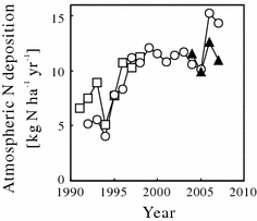 This study evaluated whether nitrogen (N) saturated upland forests can degrade downstream water quality in the Tatara River Basin, northern Kyushu, western Japan. Our hypothesis is that elevated atmospheric N deposition degrades downstream water quality in a watershed containing N-saturated forests because a considerable amount of atmospherically deposited N passes into the streams without being retained. Synoptic stream water samplings were conducted at 23 sites across a wide range of land-use categories in the basin over 1 year. A long-term temporal analysis of downstream water quality over the last 30 years (1977–2007) was conducted and compared with long-term trends in related factors such as urban/agricultural activity, sewage wastewater treatment, atmospheric N deposition, and forest condition. The results showed that atmospherically deposited N to N-saturated forests can be a large enough non-point source of N leaving the watershed to impact downstream water quality. This was highlighted by the reduction in pollutant exports derived from urban/agricultural activities, an increase in atmospheric N deposition, and the maturation of coniferous plantation forests in the past 30 years. These have led to reductions in total phosphorus and organic nitrogen concentrations in downstream water, whereas downstream nitrate (NO3 −) concentrations increased over the last 30 years. The consequent increase in the downstream N:P ratio indicated P limitation. Reducing the NO3 − exports from N-saturated upland forests is suggested as a strategy to improve regional downstream NO3 − pollution, but involves intercontinental-scale action in reducing atmospheric N emissions.